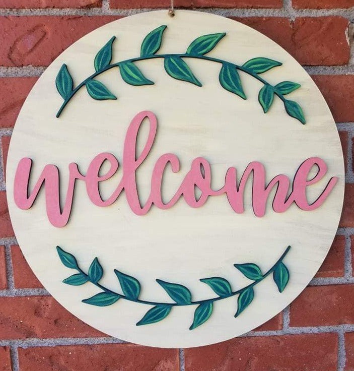 This elegant layered design features a classic “Welcome” paired with soft olive leaves for added depth and charm. The round shape and timeless greenery make it a perfect base for everyday front door décor, seasonal paint parties, or thoughtful handmade gifts.