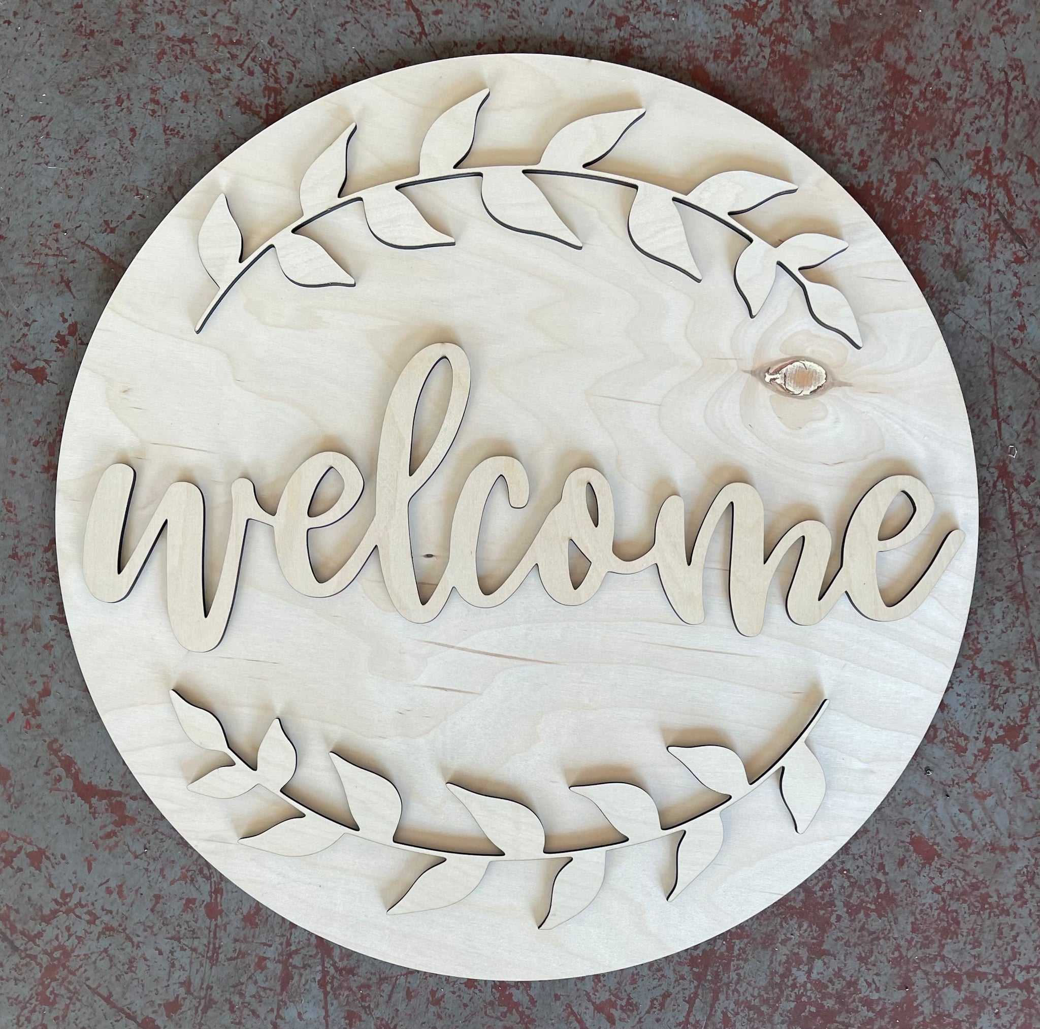 Welcome guests in style with this 19” Circle With Layered Welcome and Olive Leaves Door Hanger Wood Blank 🌿✨