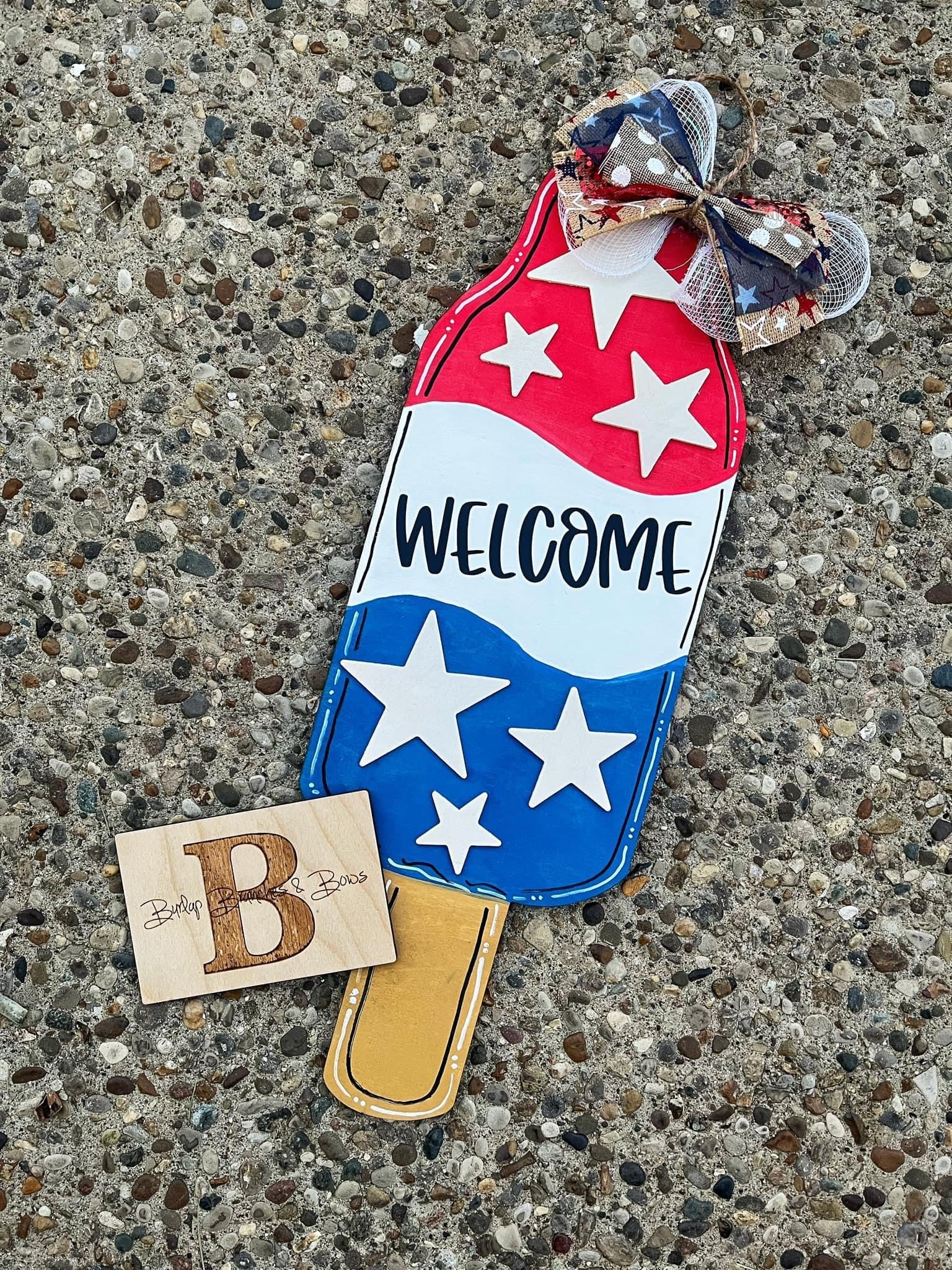 Bring retro summer vibes to your next project with our 23" x 8" Rocket Popsicle Door Hanger Wood Craft Blank. This classic shape is instantly recognizable and perfect for bold reds, whites, and blues—or any color combo that screams summertime.