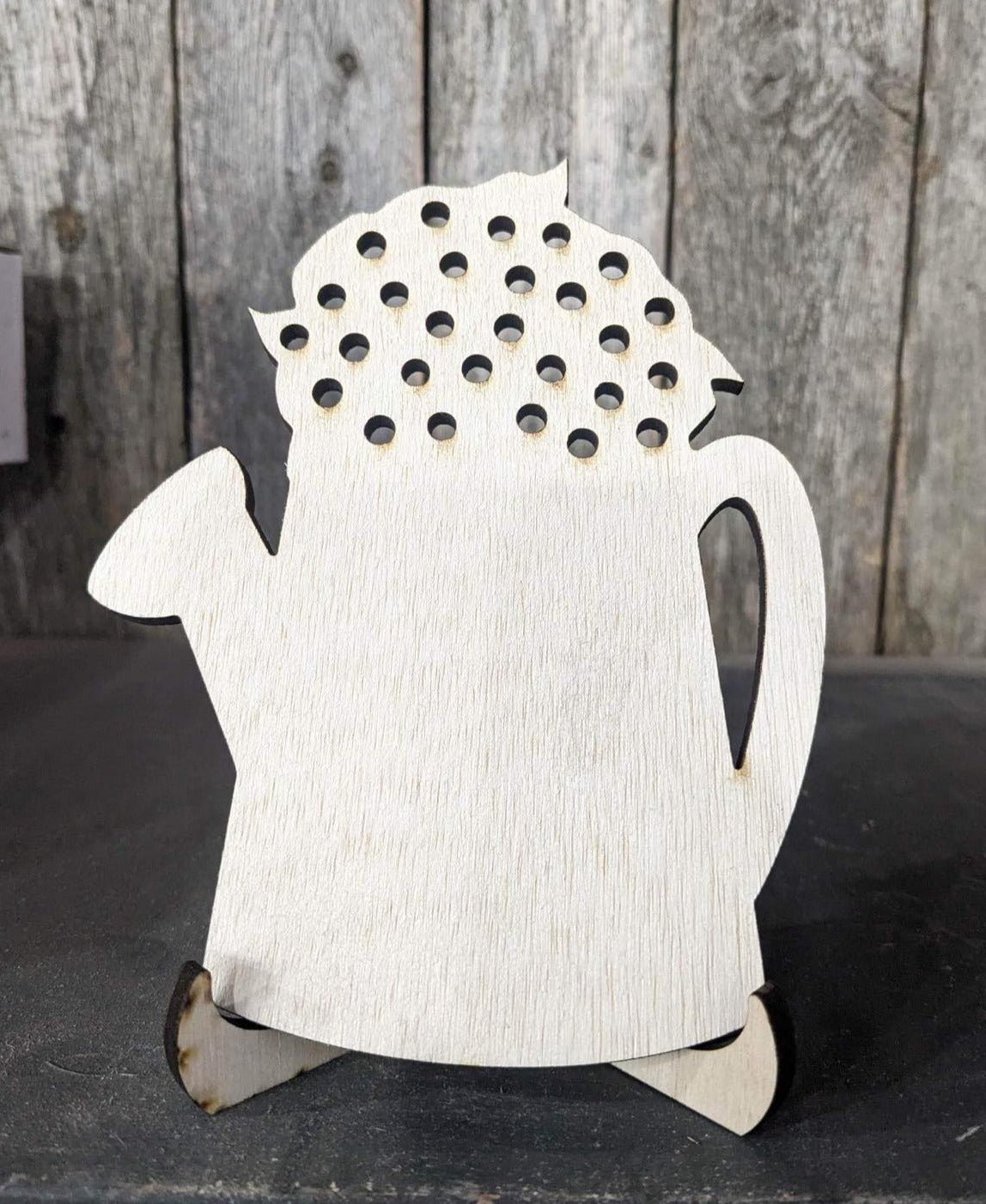 This laser-cut wood piece is designed to hold faux flowers, florals, or greenery, making it perfect for tiered trays, shelves, desks, and paint party projects. The included stand allows it to sit upright, while the watering can shape adds a fun, farmhouse-inspired touch.